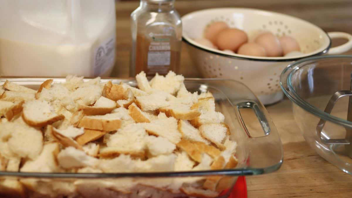 Using a knife and cutting bard, cut the bread into cubes. Put the bread crumbs into a greased baking dish. If you want a more classic French Toast casserole you can slice the bread and lay the bread slices at an angle in the baking dish, instead of a single layer.