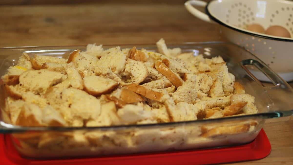 - Put bread into a 9×13 or larger casserole dish.