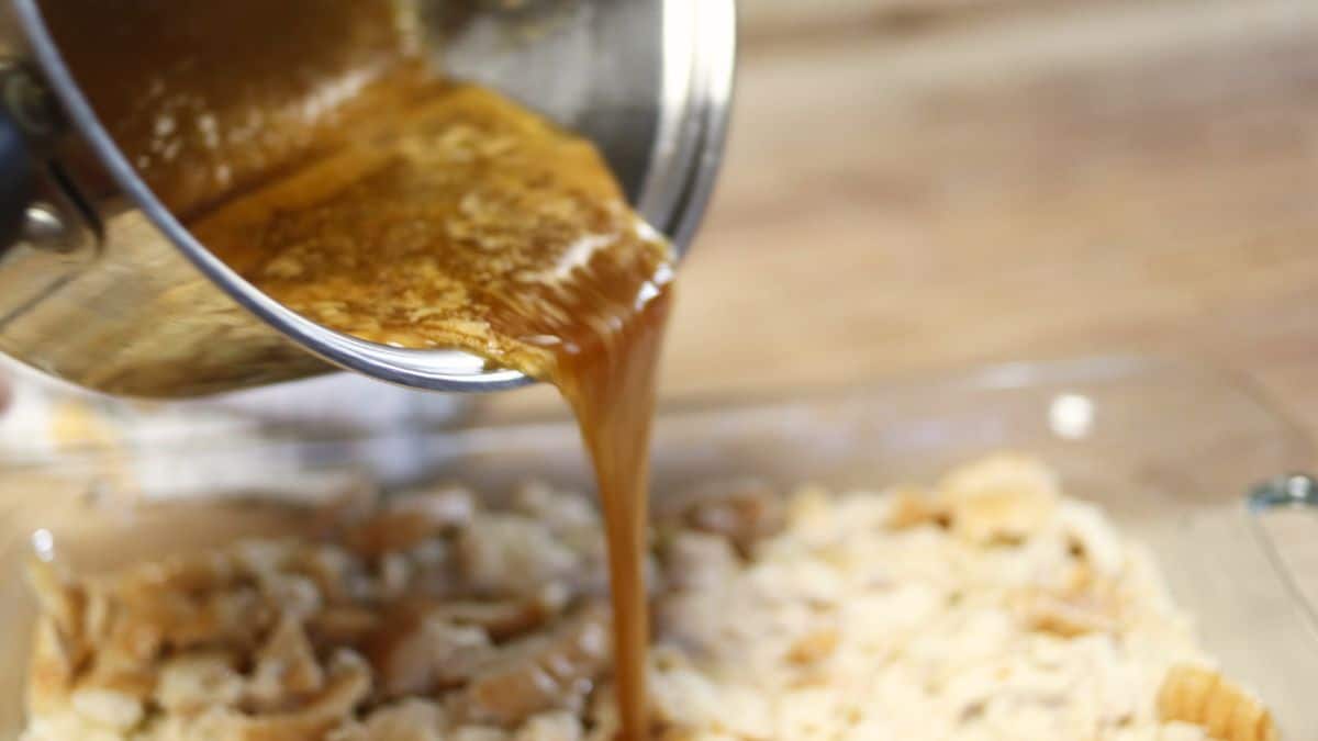 - Melt butter and cook with brown sugar and syrup until just boiling. Pour over bread mixture.½ cup Butter, 1 cup Brown Sugar, 3 tbsp Maple Syrup