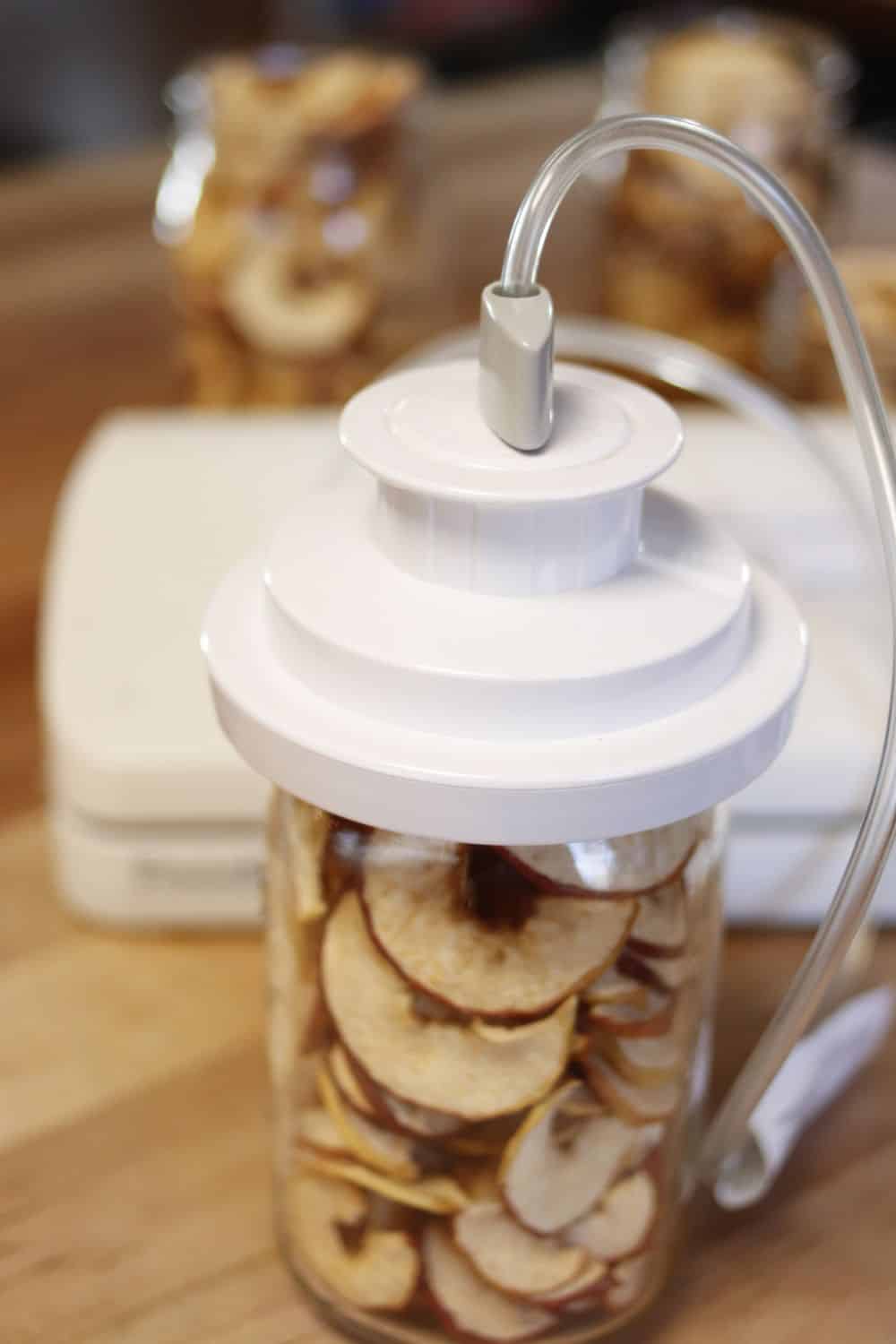 - Store dehydrated apples in an airtight container for up to six months. Vacuum seal for storage up to a year.