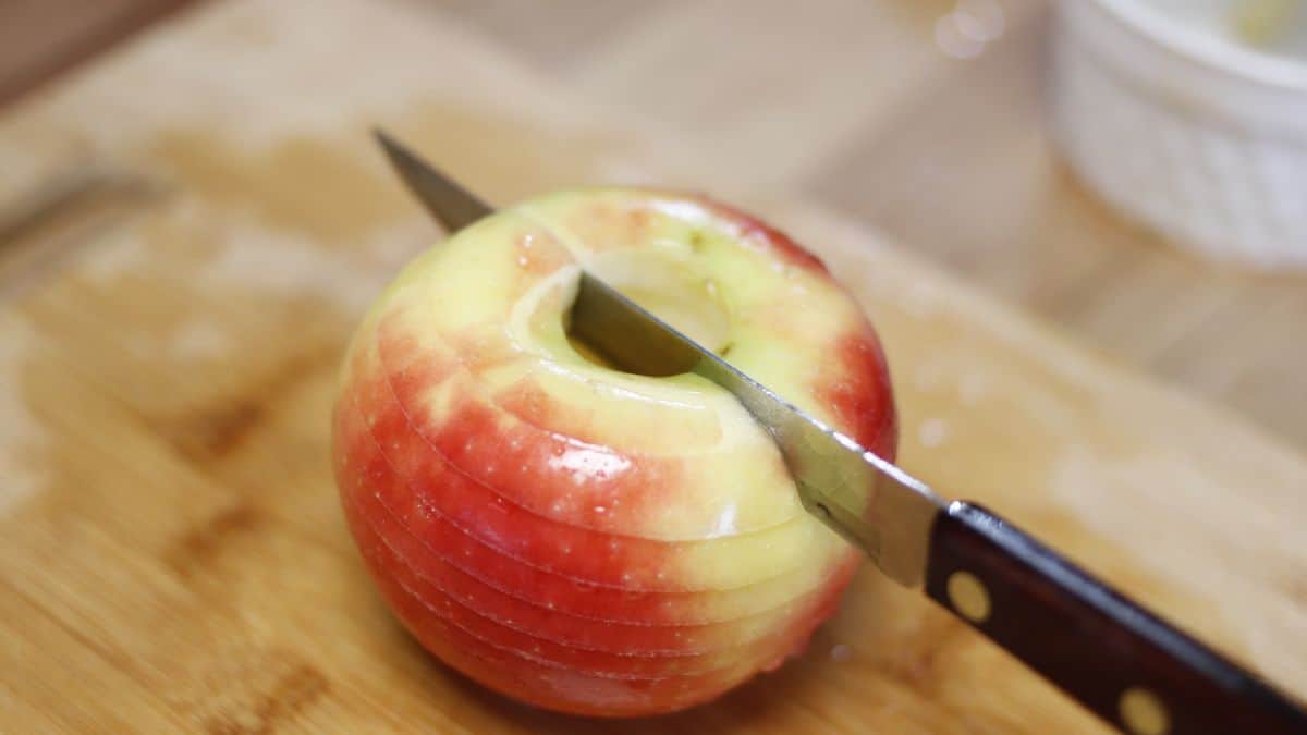 - Core apples and slice evenly. An apple corer/slicer works great or you can use a mandolin to get even slices after you core the apple. A simple kitchen knife works just fine too, don’t think you have to have special tools to slice apples for dehydrating.